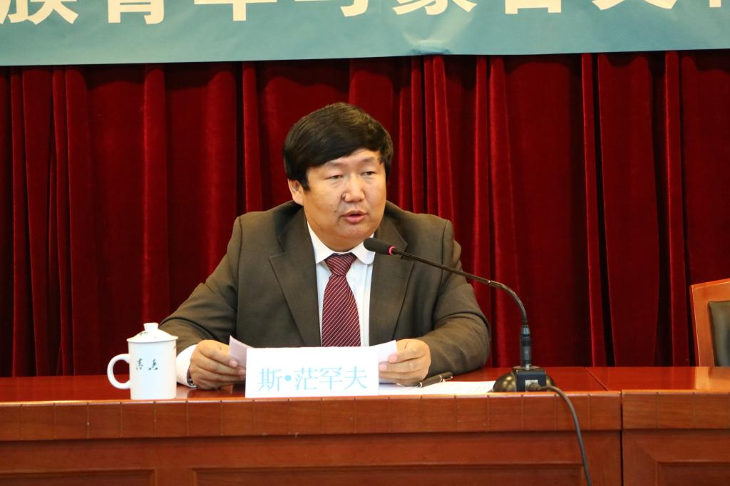 内蒙古青少年杂志社副社长斯·茫罕夫老师发言,他对开展此次活动的意义、多兰教授《蒙古族青年与蒙古文化》一书的写作及出版过程进行详细的介绍。
