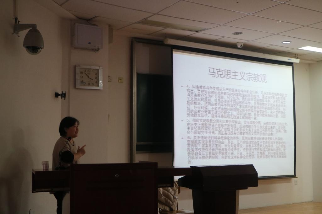 斯琴高娃老师以我国主要的宗教概况为开篇,为同学们讲解信教群众的分布情况、马克思主义宗教观、我国社会主义时期宗教基本特点、党的宗教工作基本方针以及如何注意防止宗教对党员思想的影响等基本问题。让同学们深刻理解宗教信仰的概念及影响,使同学们对宗教信仰的了解更加透彻。随后又特别强调了三点: