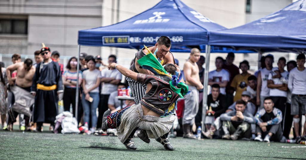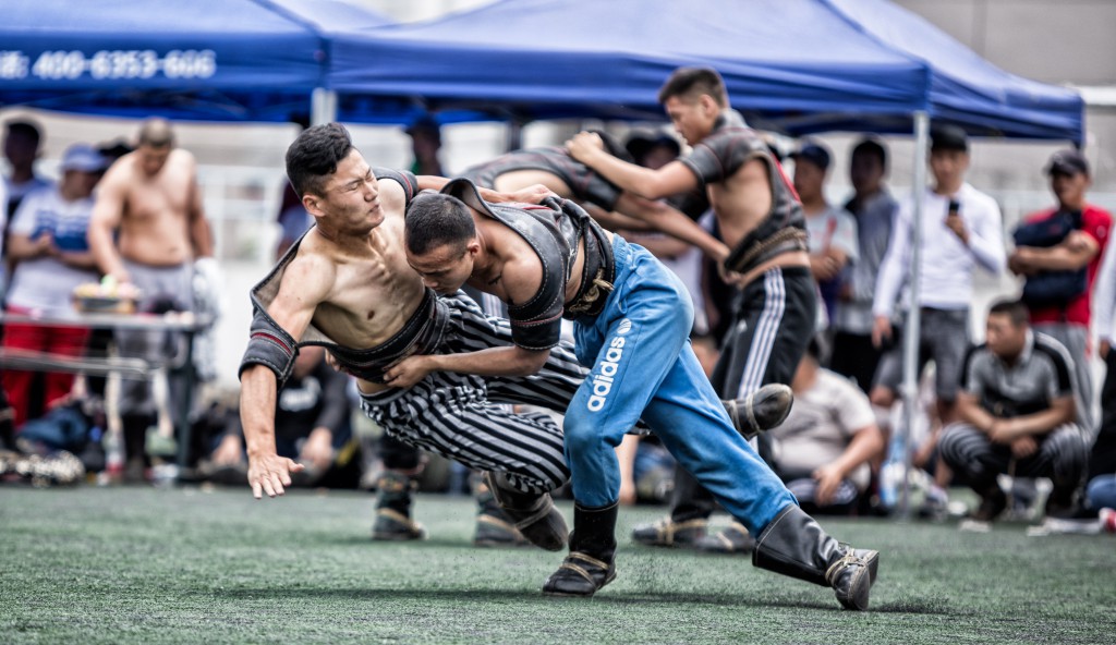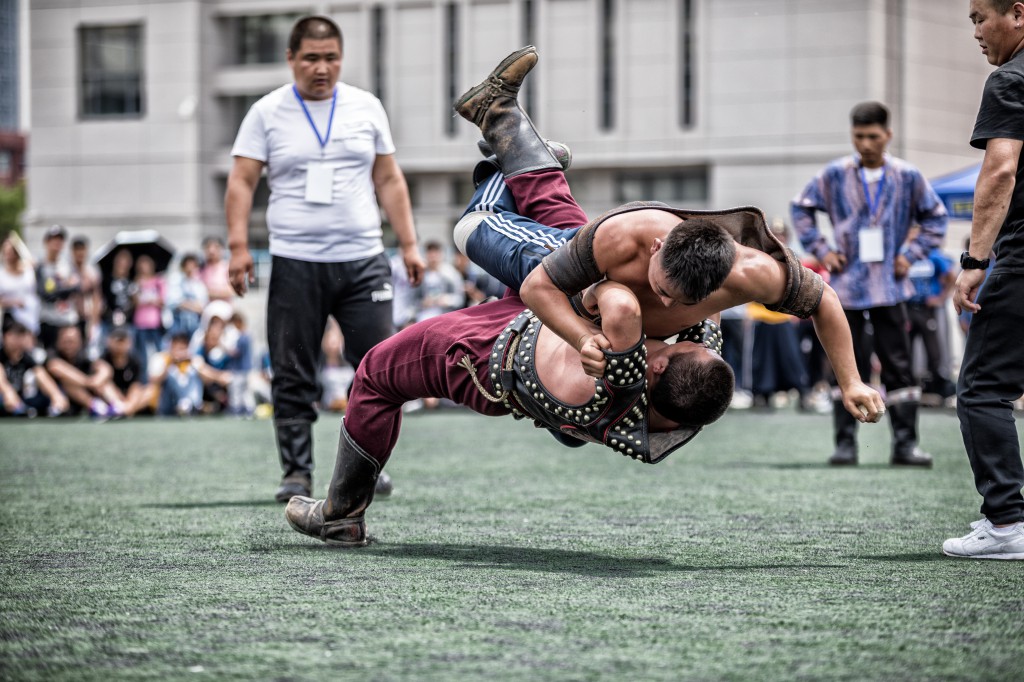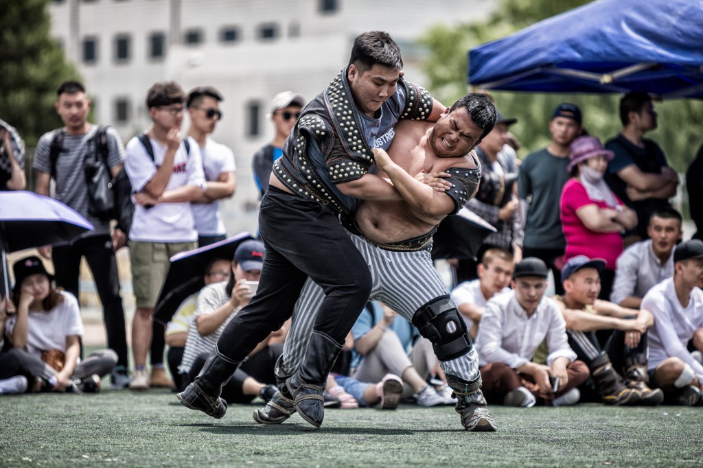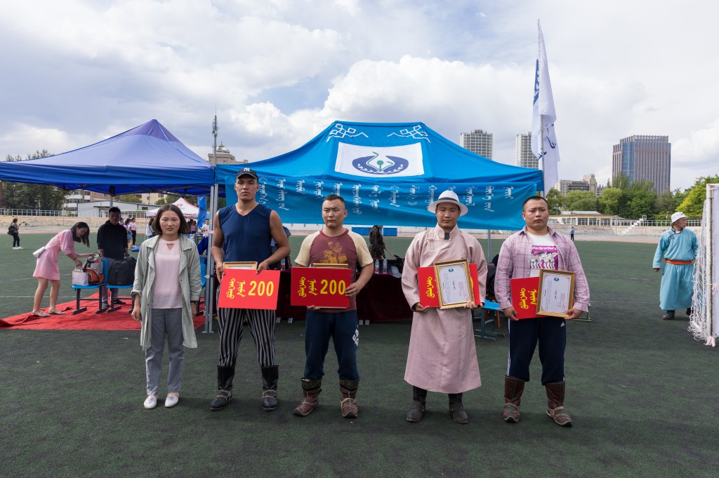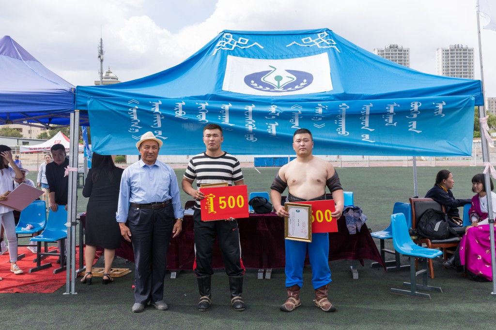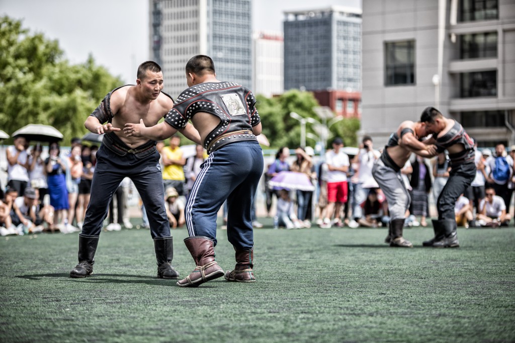 搏克比赛拉在蒙古族长调《都冷扎那》的悠扬歌声中拉开帷幕。来自呼市各高校128名参赛选手上身穿“照德格”,脚蹬蒙古靴或马靴,挥舞着壮实的双臂,跳着鸢步舞纷纷入扬,在观众的呐喊助威声中,搏克手们开始了激烈的角逐。只见他们时而扎稳马步,时而灵活移动,虽不是专业选手,却将搏克运动的基本动作捉、拉、扯、推、压运用的恰到好处、淋漓尽致。比赛采用分组循环淘汰制,经过五轮激烈的角逐,前8名选手脱颖而出。最终来自内蒙古师范大学的巴图吉日嘎拉以优越的表现夺得了冠军、内蒙古财经大学的阿日贡宝力高夺得了亚军、师范大学的韩宝峰夺得了季军。