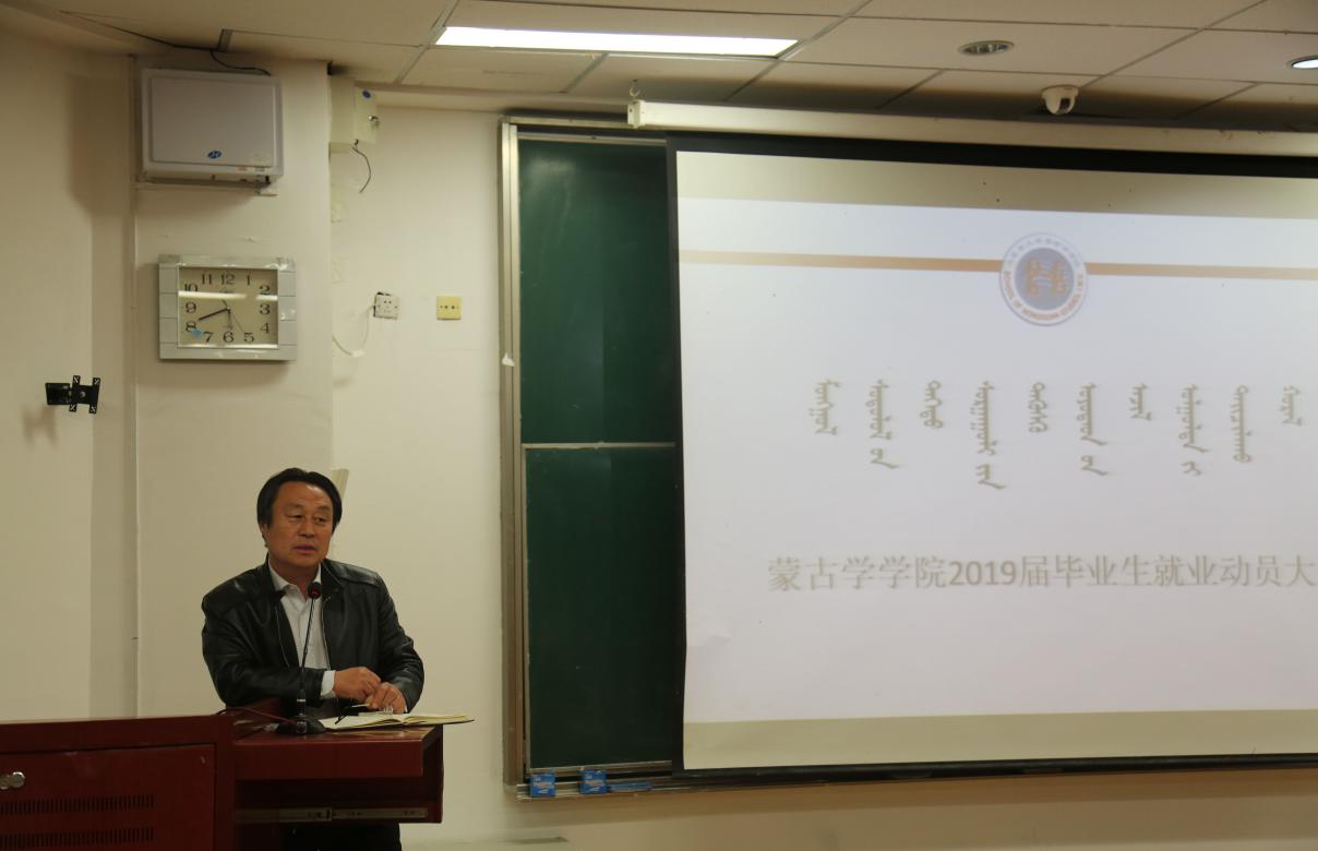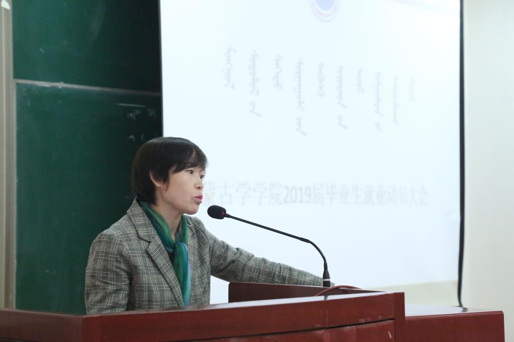 八格副书记做了就业动员。首先通报2018届毕业生就业状况,指出2019届毕业生就业途径和注意事项。她建议毕业生可以从考研升学、基层项目就业、预征入伍、企业就业、出国留学、自主创业以及参加公务员、事业单位考试等渠道落实就业。此外,八格老师还希望毕业生要了解形势,主动出击;要认清自己,明确目标;要摆正心态,做好充分的准备;要利用各种途径,收集就业信息,珍惜在校的有限时间实现就业。