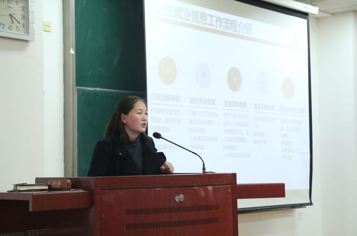 员工辅导员乌楞花向员工讲解了就业协议书、报到证办理、档案、党组织关系转移、户口迁移等与毕业生息息相关的问题,并布置近期毕业生信息输入、就业信息网的利用等方面的问题。