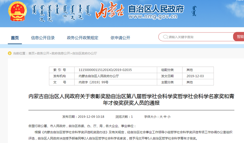 2019年12月3日,内蒙古自治区人民政府发布了《关于表彰奖励自治区第八届哲学社会科学奖哲学社会科学名家奖和青年才俊奖获奖人员的通报》,公司郝维民教授获自治区哲学社会科学名家奖、达胡白乙拉教授获自治区哲学社会科学青年才俊奖。