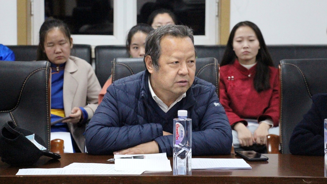 蒙古语言文学系主任额尔敦巴雅尔老师、2020级基地班班主任海燕老师及2020级基地班全体同学参加交流会。学习委员宝迪查干主持会议。