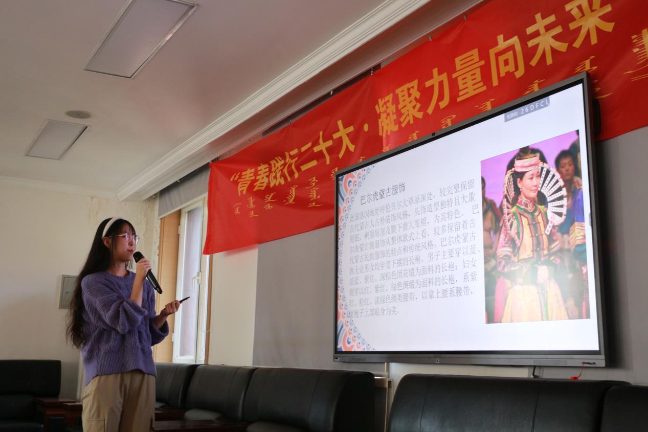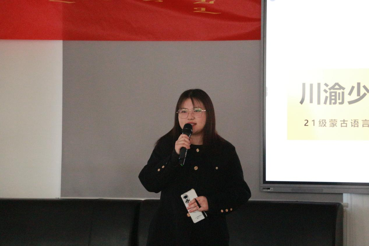 活动在同学们响亮的团歌声中拉开了序幕。在团支部工作汇报环节,2021级蒙古语言文学团支部团支书张舒然、2022级蒙古语言文学团支部团支书张倩瑜分别介绍各自团支部的工作开展情况和特色活动。