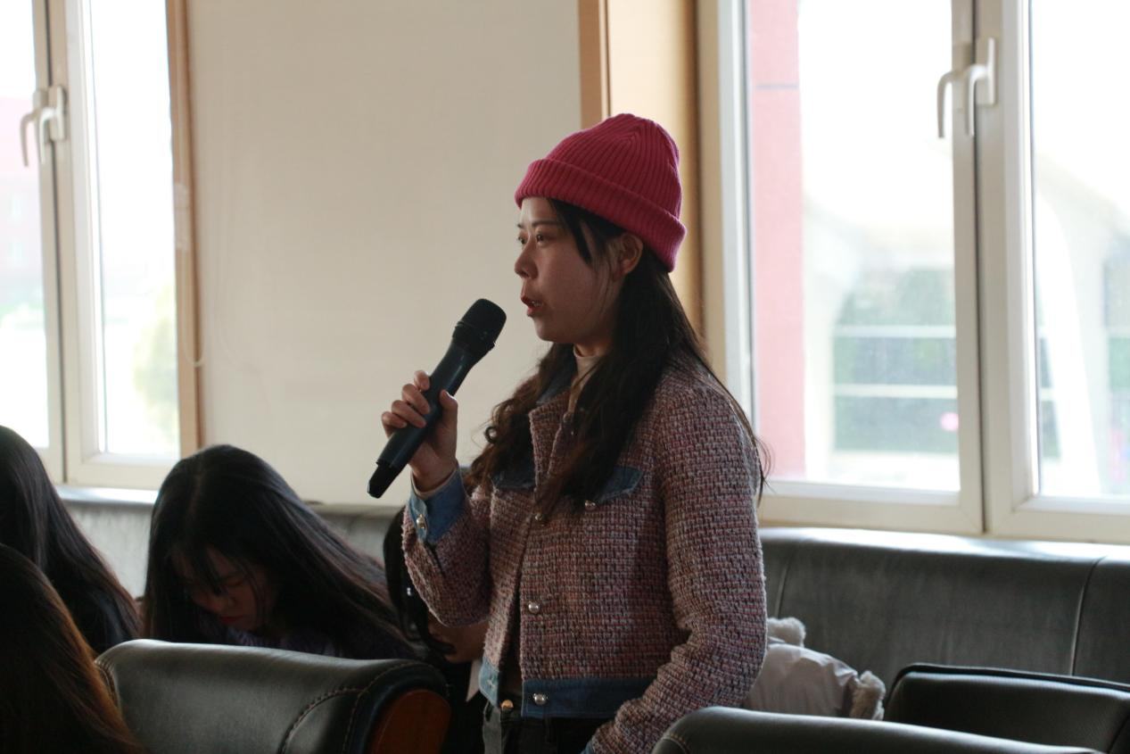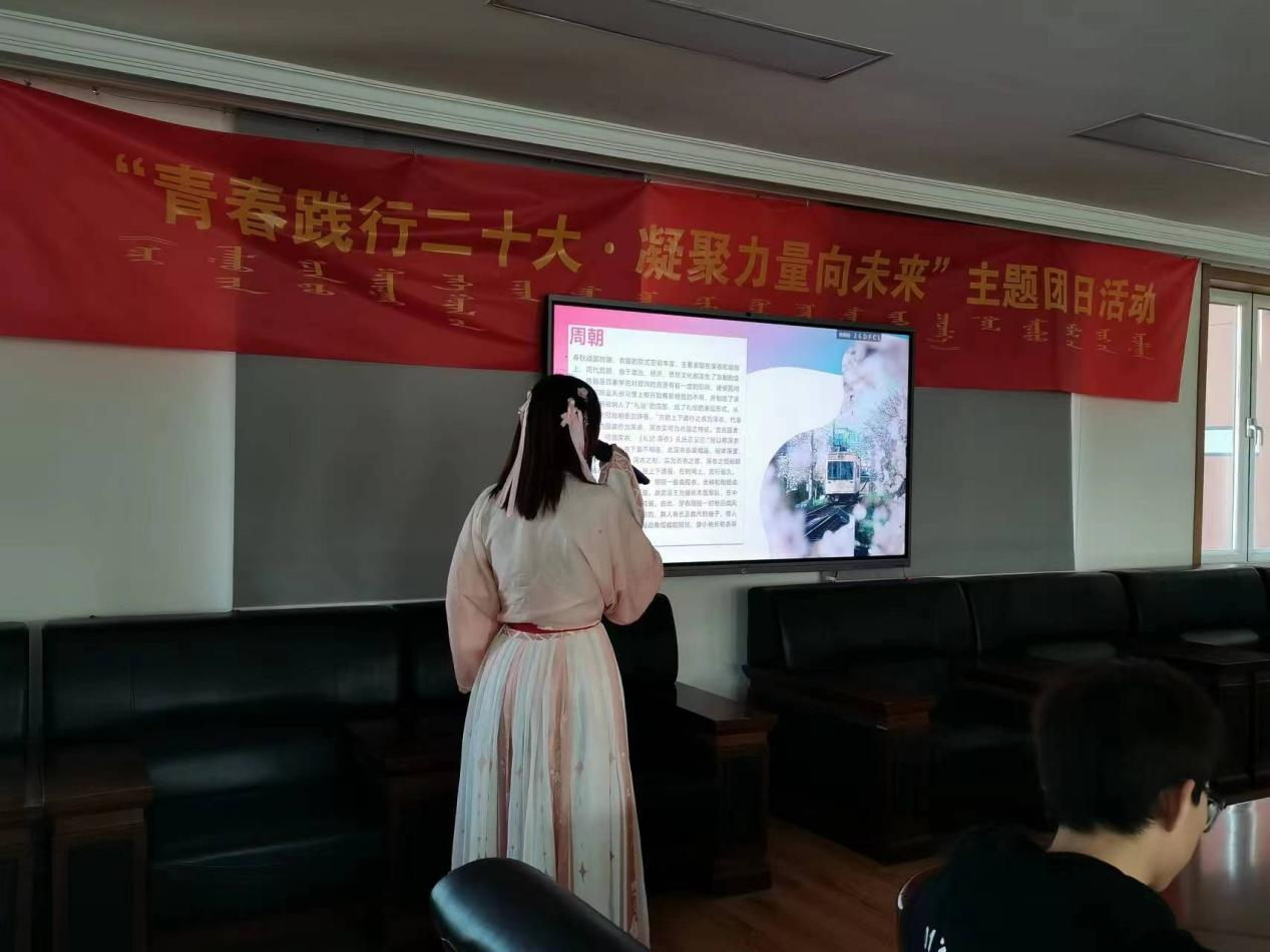 在介绍中华民族传统服饰环节,贺佳佳同学对汉服的起源与发展娓娓道来,内容丰富全面,形象生动,并配合多彩的的图片让一件件传统服饰展现在同学们的眼前。随后,陈梦瑶同学对汉服文化进行补充介绍与说明。两位同学身着汉服进行分享,更加具现化的体现出汉服的美。接下来,由包洪泉同学介绍蒙古族服饰,使各位同学感受到了蒙古族服饰文化的绚烂。随后石雯洁同学对蒙古族服饰进行了细致入微的分享,让同学们了解到了蒙古袍上美丽的配饰及男女衣着之间的差别。为烘托现场气氛,高名扬与郭雨婷两位同学进行了舞蹈表演。《折枝花满衣》伴乐响起,同学翩然起舞,在她们展示着古典舞独特美时,同学们也感受着丰富多彩的中华优秀民族传统艺术,活动现场的氛围也迎来了一波高潮。
